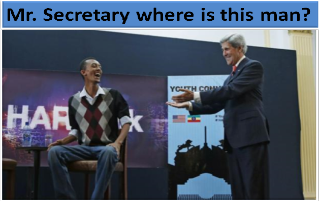 Mr. Secretary, when I read your government’s promise of working together with others to solve peace, democracy, good governance, and human rights challenges in Africa, I was elated and my expectation grew by the day because I know for sure these are the problems that plagued my native country Ethiopia. In May 2013, I was also moved when I saw your picture with Ethiopian blogger Nathaniel Feleke, one of the founders of the renowned Zone –nine bloggers. Mr. Secretary, last week when you went back to Ethiopia, Nathaniel Feleke whom you gave a big hug with chanting smile was being tortured inside the notorious Makelawi prison.